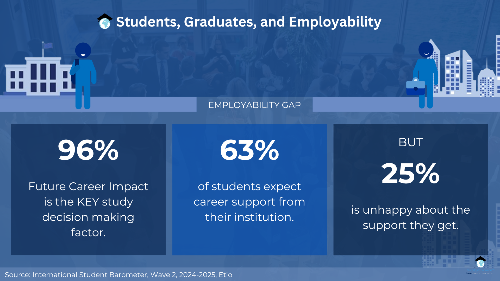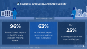 This infographic is based on International Student Barometer data about how currently enrolled students feel about their employability. Regarding their expectations from their university, 63% of graduates need help in finding employment. This is striking because firstly, 63% is a fairly large chunk of 100%, and secondly, it means that a large fraction of students are not being given the level of support they expect. Moreover, students do not feel employable. Almost half of graduates feel ill-prepared for the world of work. Needless to say, this is not what they had in mind when starting their degree course. A gap between expectations and reality has emerged, in many cases so has the disappointment.