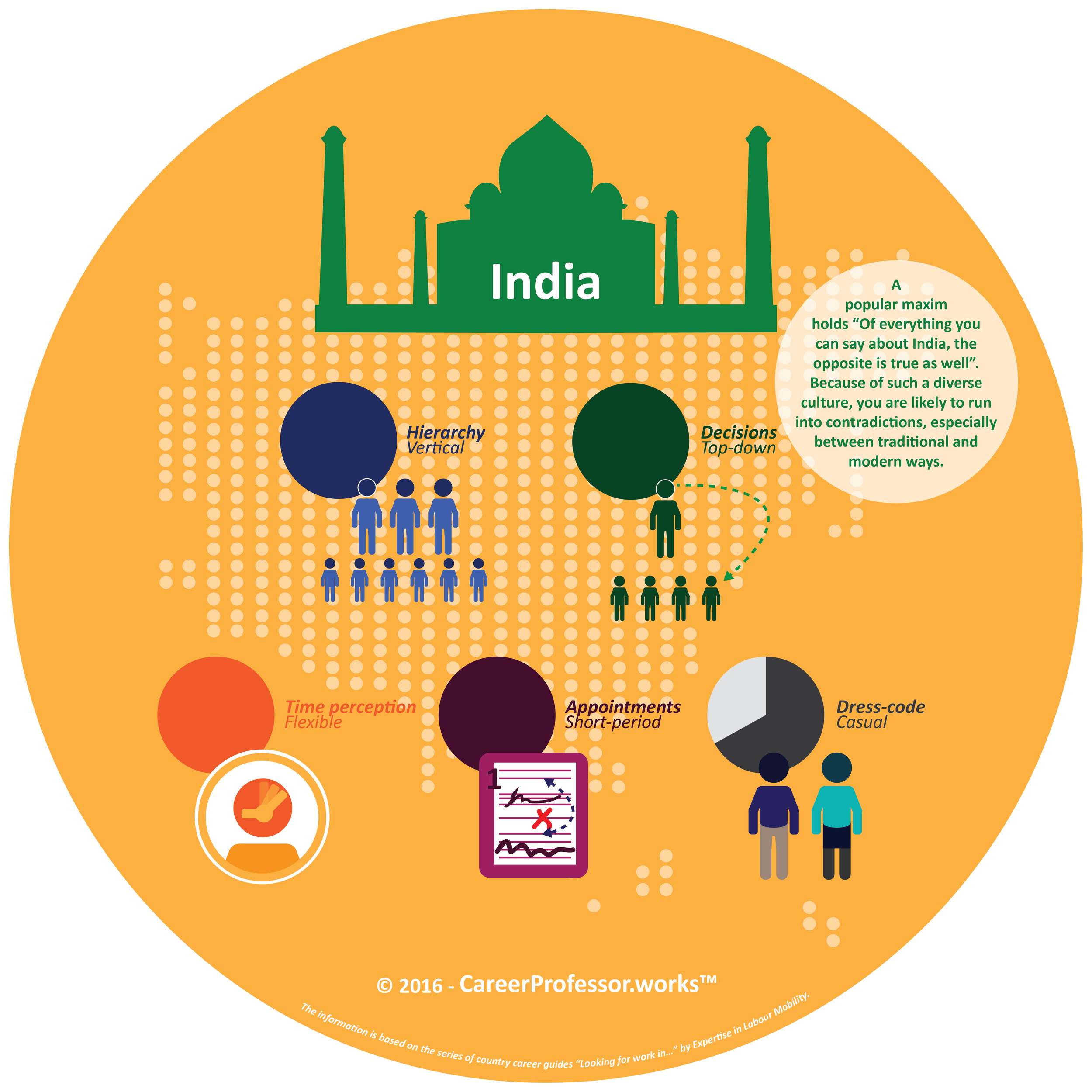 This CareerProfessor.works infographic will present some things you need to know about the Indian working environment. Click here for a legend of the infographic.